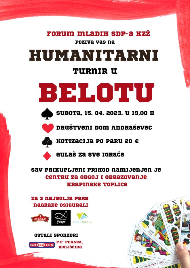 Forum mladih SDP-a KZŽ poziva sve na humanitarni turnir u belotu koji će se održati 15.4.2023. (SUBOTA) s početkom u 19 sati u Društvenom domu Andraševec (OROSLAVJE).