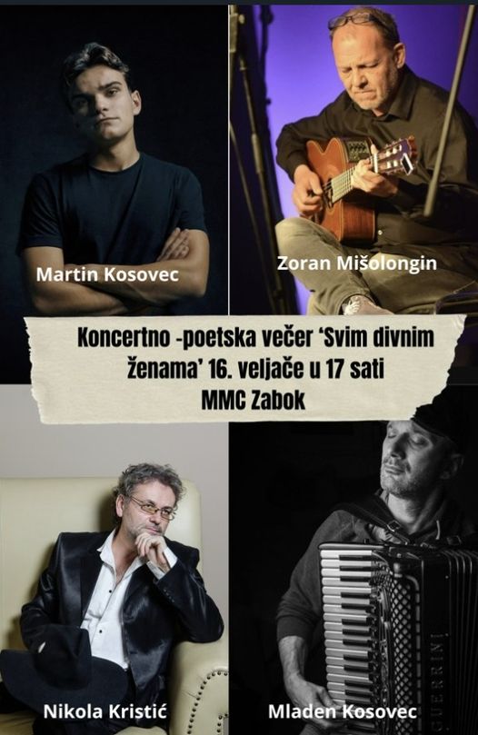 S velikim ponosom i radošću najavljujemo koncertno - poetsku večer pod nazivom 'Svim divnim ženama' u izvedbi tria 'Duo' uz vrlo, vrlo posebnog gosta! Tri vrsna umjetnika - Zoran Mišolongin (tekstopisac, kantautor, skladatelj, gitarist, vokalni izvođač, producent, autor brojnih hitova domaćih izvođača), Mladen Kosovec ( multiinstrumentalist, skladatelj i aranžer, koji svira gitaru, harmoniku, klarinet, stalni član ansambla LADO) i Nikola Kristić (dugogodišnji novinar i urednik, pjesnik i interpret) udružili su snage te pripremili glazbeno - poetski koncert u znaku ljubavi, najavljuje Grad Zabok.