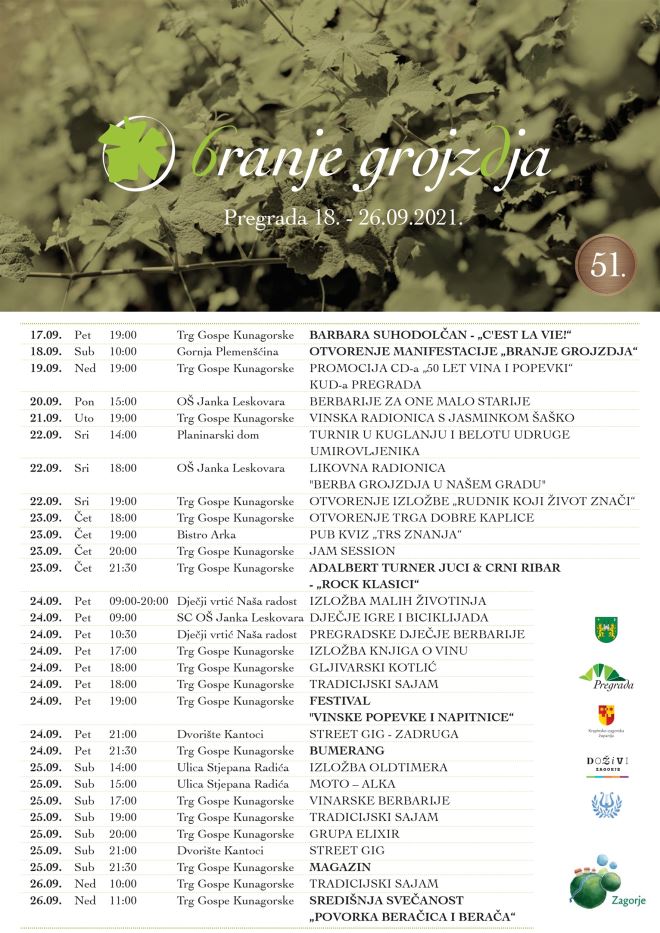 U Pregradi ovog petka počinje manifestacija 'Branje grojzdja'. Događanja će se održavati od 18. do 26. rujna, a na samom otvorenju u petak predviđen je koncert Barbare Suhodolčan.