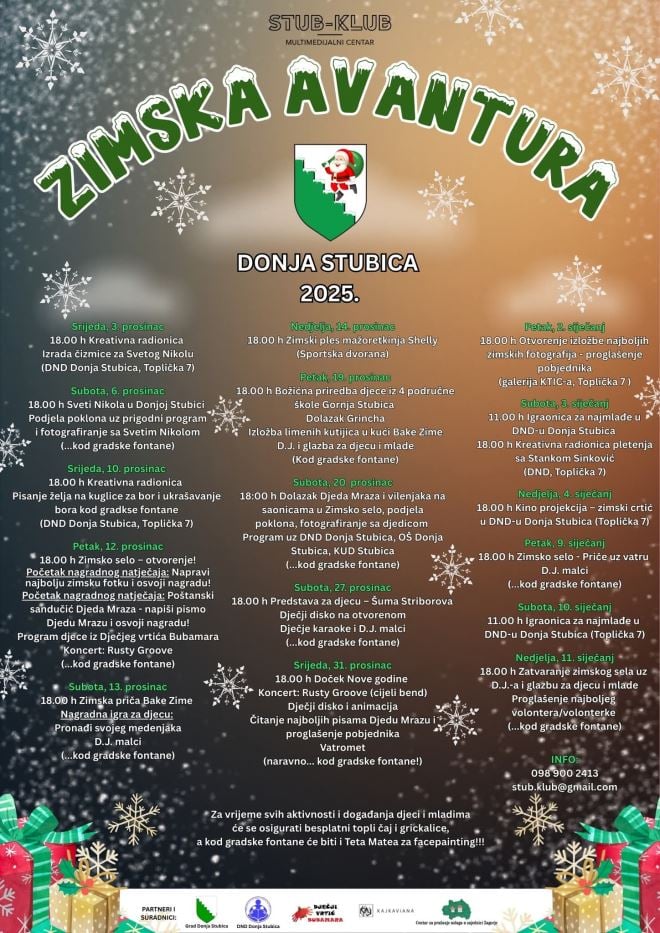Od petka do nedjelje svi putevi vode u Donju Stubicu. Naime, počinje bogati program nove manifestacije, Zimske avanture! Kod gradske fontane u petal 12. prosinca bit će veliko otvorenje te početak nagradnog natječaja - napravi najbolju zimsku fotku i osvoji nagradu! Tu je i nagradni natječaj Poštanski sandučić Djeda Mraza - napiši pismo Djedu Mrazu i osvoji nagradu, kao i program djece Dječjeg vrtića Bubamara i koncert Rusty Groove.