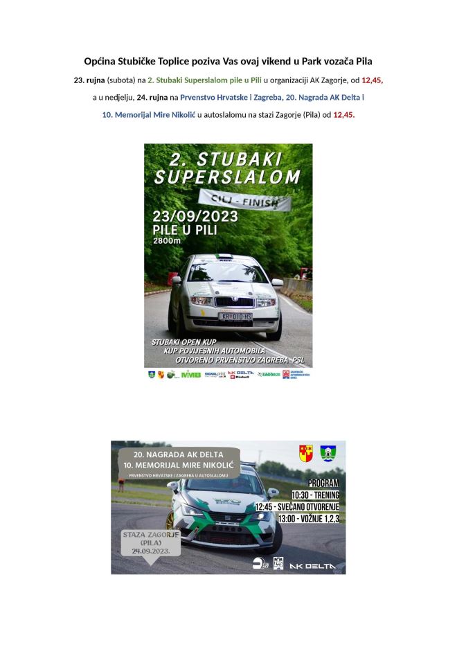 Općina Stubičke Toplice poziva sve ljubitelje automobilizma na dva događanja ovoga vikenda. U subotu u Parku vozača Pila održat će se 2. Stubaki Superslalom pile u Pili u organizaciji AK Zagorje, od 12,45, a u nedjelju je na rasporedu Prvenstvo Hrvatske i Zagreba, 20. Nagrada AK Delta i 10. Memorijal Mire Nikolić u autoslalomu na stazi Zagorje (Pila) od 12,45 sati.