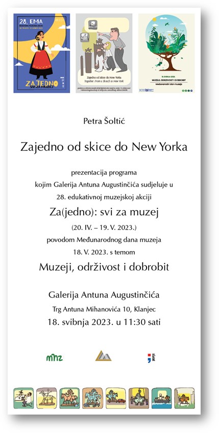 Na Međunarodni dan muzeja, u četvrtak 18. svibnja 2023. u 11:30, u Galeriji Antuna Augustinčića u Klanjcu, Trg Antuna Mihanovića 10, muzejska pedagoginja Petra Šoltić predstavit će svoj program Zajedno od skice do New Yorka, kojim Galerija Antuna Augustinčića sudjeluje u 28. edukativnoj muzejskoj akciji Za(jedno): svi za muzej te odgovara ovogodišnjoj ICOM-ovoj temi obilježavanja Međunarodnog dana muzeja Muzeji, održivost i dobrobit.