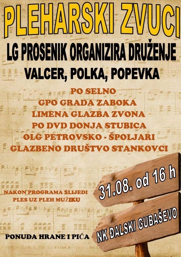 Limena glazba Prosenik organizira ovu subotu 31. kolovoza događanje pod nazivom 'Pleharski zvuci' na nogometnom igralištu NK Đalski Gubaševo.