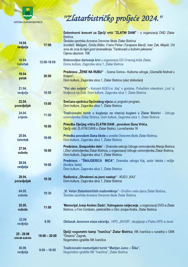 Ovogodišnja manifestacija Zlatarbistričko proljeće počinje dobrotvornim koncertom u Školskoj sportskoj dvorani Osnovne škole Zlatar Bistrica 14. travnja s početkom u 17 sati. Prikupljen iznos od ulaznica uplatit će se kao dobrotvorni prilog Dječjem vrtiću Zlatni dani za sanaciju terase starog dijela zgrade.