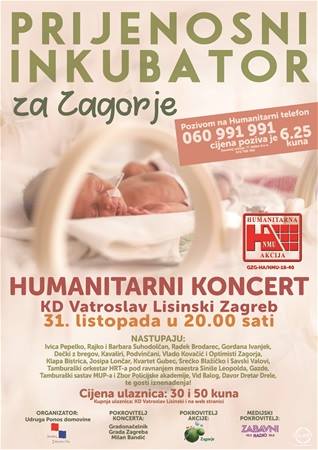 U organizaciji Udruge Ponos domovine započela je humanitarna akcija Prijenosni inkubator za Zagorje. Do 30. studenog u funkciji je i telefon 060 991991 čijim pozivom možete donirati 6,25 kuna za kupnju prijenosnog inkubatora za Opću bolnicu Zabok i bolnicu hrvatskih veterana. Središnji događaj bit će koncert u srijedu 31. listopada od 20 sati u dvorani Vatroslav Lisinski na kojem će nastupiti poznata glazbena imena.