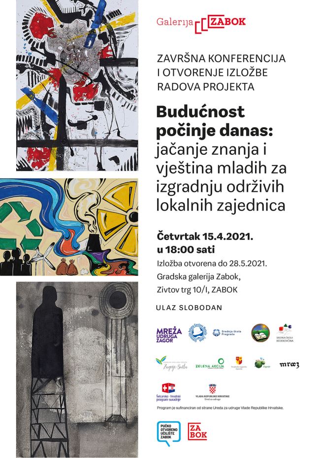 U četvrtak, 15. travnja otvorara se izložba Budućnost počinje danas: jačanje znanja i vještina mladih za izgradnju održivih lokalnih zajednica u Gradskoj galeriji Zabok s početkom u 18:00 sati. Izložba ostaje ostvorena do 28. svibnja, a ulaz je slobodan. Događanje se održava uz poštivanje svih epidemioloških mjera.