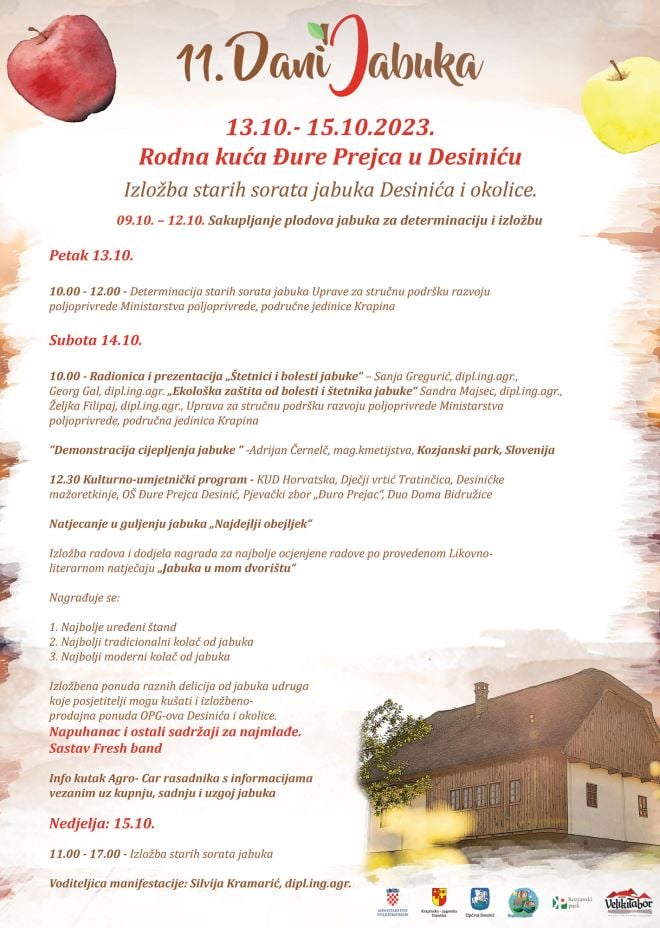 I ove godine održava se manifestacija u općini Desinić - 11. dani jabuka. Manifestacija će se održati krajem ovoga tjedna od petka do nedjelje u Rodnoj kući Đure Prejca u Desiniću. Sve posjetitelje očekuje Izložba starih sorata jabuka Desinića i okolice, ali i čitav niz popratnih sadržaja u sva tri dana.