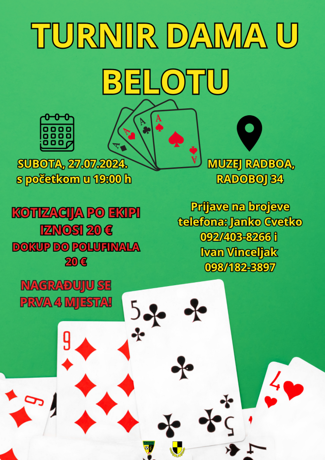 Športsko kulturna udruga građana „Josip Poljak“ Bregi Radobojski uz pomoć Općine Radoboj i Muzeja Radboa organizira u subotu, 27. srpnja s početkom u 19:00 sati turnir dama u belotu. Biti će to treći po redu turnir koji će se održati u prostorijama Muzeja Radboa. Kotizacija po ekipi iznosi 20 € uz dokup do polufinala u iznosu 20 €, a cjelokupni iznos ići će u nagradni fond te će bit novčano nagrađena prva 4 osvojena mjesta. Prijave za sudjelovanje ostvaruju se na brojeve telefona: Janko Cvetko 092/403-8266 i Ivan Vinceljak 098/182-3897