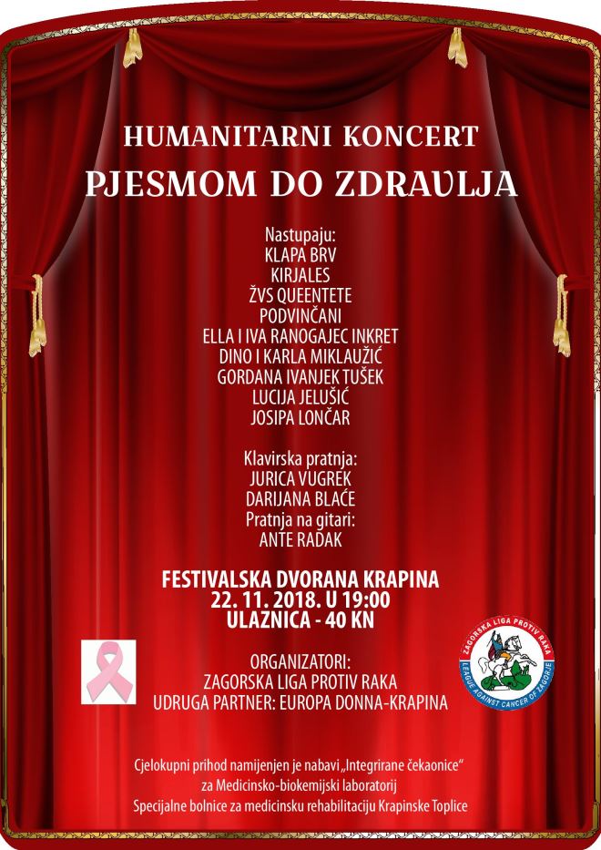 Koncert pod nazivom „Pjesmom do zdravlja“, održati će se u četvrtak 22. studenog s početkom u 19 sati, u Festivalskoj dvorani u Krapini. Cijena ulaznice iznosi 40 kn.