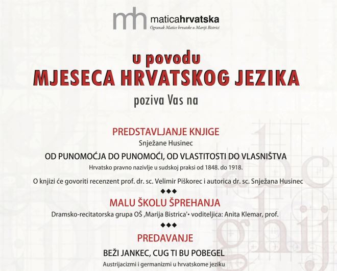 Ogranak Matice hrvatske u Mariji Bistrici pridružuje se manifestaciji Mjesec hrvatskoga jezika, koja je pokrenuta s ciljem podizanja razine svijesti o važnosti očuvanja hrvatskoga jezika kao temelja hrvatskoga nacionalnog identiteta. Mjesec hrvatskoga jezika započinje 21. veljače, na Međunarodni dan materinskog jezika, a završava 17. ožujka, na dan objave Deklaracije o nazivu i položaju hrvatskoga književnog jezika 1967. godine. U povodu Mjeseca hrvatskoga jezika OMH u Mariji Bistrici pripremio je program koji će biti održan u subotu, 5. ožujka, u Dvorani Božjeg milosrđa u Mariji Bistrici. Program počinje u 18 sati te se sastoji od tri dijela. U prvom dijelu biti će predstavljena knjiga dr. sc. Snježane Husinec ''Od punomoćja do punomoći, od vlastitosti do vlasništva. Hrvatsko pravno nazivlje sudske prakse od 1848. do 1918.''