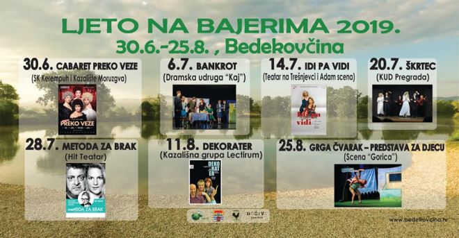 - Spojili smo kulturu i uživanje u Bajerima u jedno te će svi posjetitelji moći uživati na predstavama na otvorenom - istaknuo je načelnik općine Darko Ban koji je predstavio ovogodišnje predstave. - Ljeto na Bajerima otvara predstava Cabaret preko veze Satiričkog kazališta Kerempuh i Kazališta Moruzgva u nedjelju 30. lipnja s početkom u 20 sati. U subotu 6. srpnja s početkom u 20 sati igrat će predstava Bankrot Dramske udruge 'Kaj', a u nedjelju 14. srpnja s početkom u 20 sati igrat će predstava Idi pa vidi Teatra na Trešnjevci i Adam scene. U subotu 20. srpnja s početkom u 20 sati na rasporedu je predstava Škrtec KUD-a Pregrada, dok u nedjelju 28. srpnja s početkom u 20 sati igra predstava Metoda za brak Hit Teatra. U nedjelju 11. kolovoza s početkom u 20 sati igrat će predstava Dekorater Kazališne grupe Lectirum, a Ljeto na Bajerima će u nedjelju 25. kolovoza u 17 sati zatvoriti predstava za djecu Grga Čvarak – naglasio je Ban uz riječi kako ga iznimno veseli što će ove godine i najmlađi uživati u predstavi na Bajerima. Predstave u kojima glume predstavili su i glumci Mirela Videk Hranjec, Mateo Videk, Mladen Ćutura, Matea Elezović Brdar te direktor Adam scene, glumac Adam Končić.