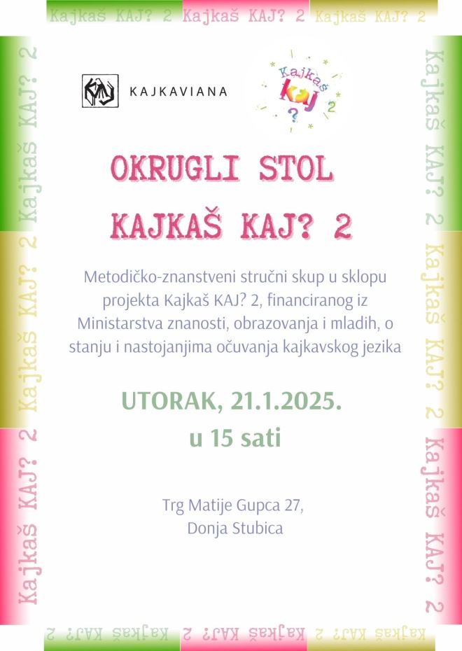 Metodičko-znanstveni okrugli stol u sklopu projekta Kajkaš KAJ? 2 održat će se u utorak, 21. siječnja 2025. u 15 sati u prostorima Kajkaviane, Trg Matije Gupca 27, Donja Stubica i otvoren je za sve zainteresirane. Na okruglom stolu će biti riječ o stanju kajkavskog jezika, na koji način ga možemo očuvati i koje su njegove zanimljivosti.