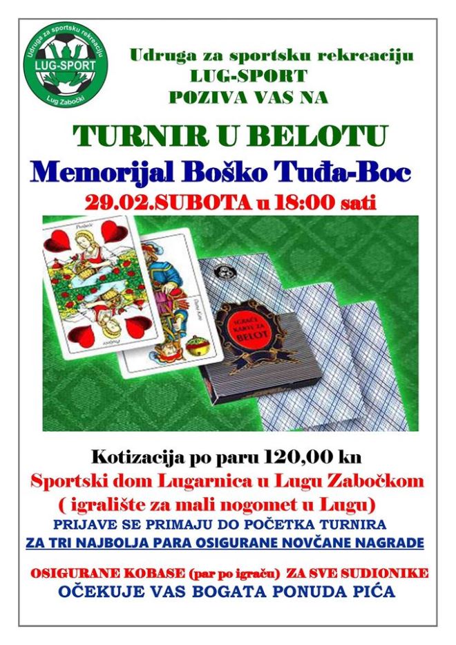 Udruga za sportsku rekreaciju Lug-sport poziva vas na turnir u beletu ‘Memorijal Boško Tuđa-Boc.’ u subotu 29. veljače u 18 sati. Kotizacija po paru iznosi 120 kuna, a turnir se održava u Sportskom domu Lugarnica u Lugu Zabočkom (igralište za mali nogomet u Lugu). Prijave se primaju do početka turnira . – Za tri najbolja para osigurane su novčane nagrade, a osigurane su kobase za sve sudionike, a tu je i bogata ponuda pica.