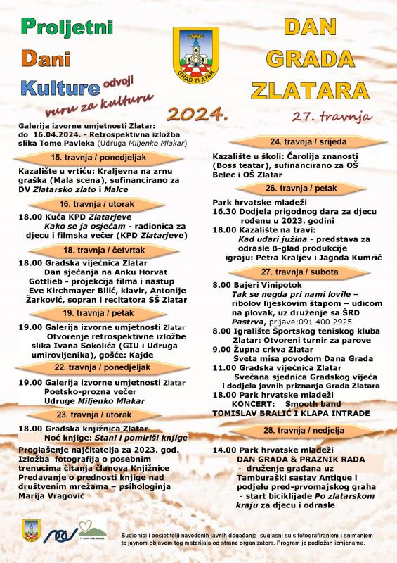 Grad Zlatar organizira brojna događanja povodom Dana grada, 27. travnja. Proljetni dani kulture počinju već 15. travnja kazalištem u vrtiću i predstavom Kraljevna na zrnu graška i nastavljaju se nizom kulturnih događanja te završavaju druženjem u gradskom parku 28. travnja kad Grad časti građane grahom uz tamburaše.