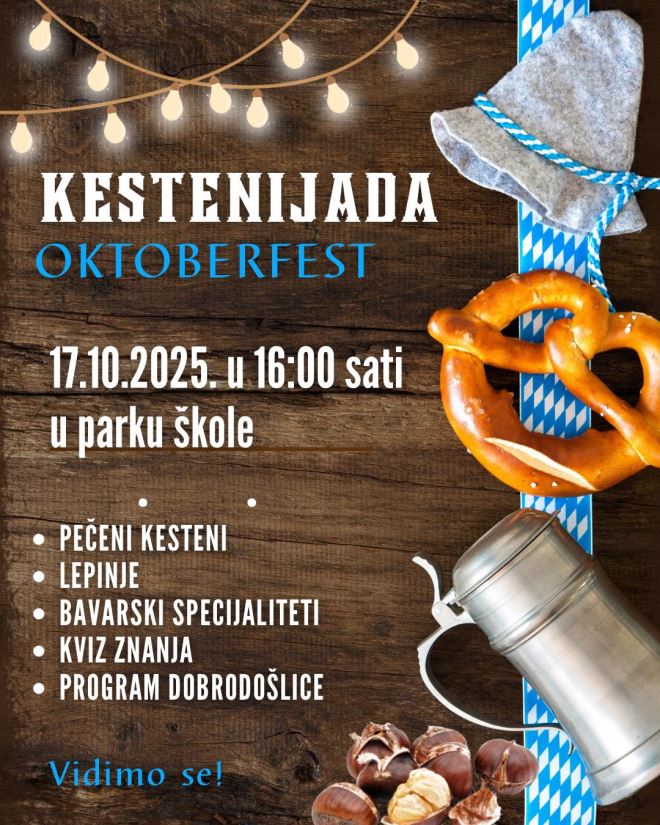 Osnovna škola Side Košutić Radoboj srdačno poziva sve mještane na Kestenijadu povodom obilježavanja Dana škole, u petak, 17. listopada 2025. godine, s početkom u 16:00 sati u školskom parku.