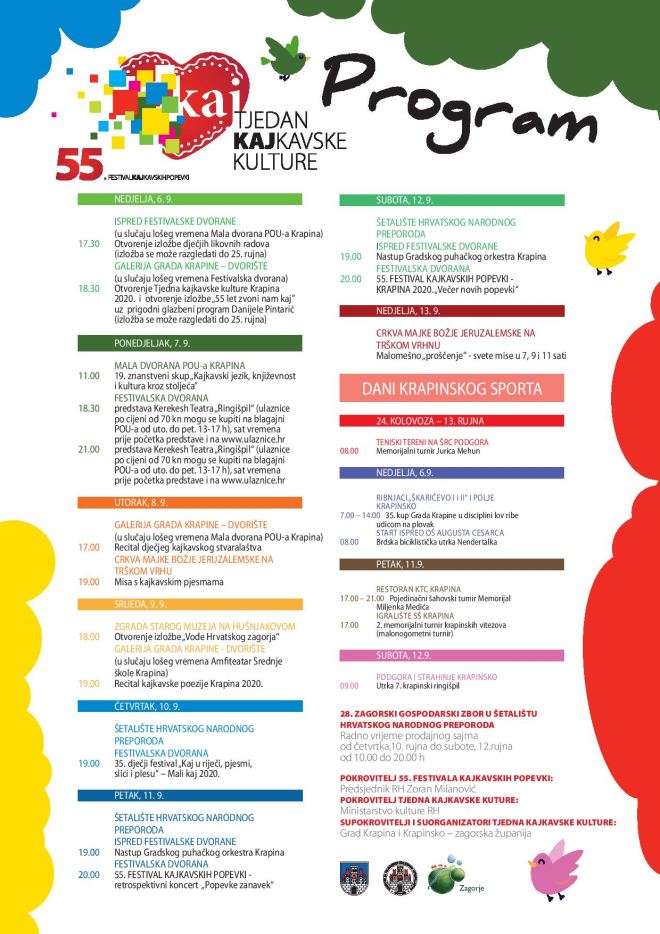 U srijedu u 18 sati u staroj zgradi Muzeja krapinskih neandertalaca održat će se otvorenje izložbe “Vode Hrvatskog zagorja”. U dvorištu Galerije grada Krapine, s početkom u 19 sati, održat će se Recital kajkavske poezije. Tradicionalni 35. dječji festival 'Kaj u riječi, pjesmi, slici i plesu' – Mali kaj 2020. održat će se 10. rujna, u 19 sati u Festivalskoj dvorani. U petak 11. rujna u 20 sati u Festivalskoj dvorani će početi retrospektivni koncert “Popevke zanavek”, a u subotu 12. rujna, također u 20 sati, “Večer novih popevki”. Neće izostati ni sportskih događanja, a u manjem obujmu održat će se i 28. Zagorski gospodarski zbor u Šetalištu Hrvatskog narodnog preporoda, od četvrtka 10. rujna do subote 12. rujna.