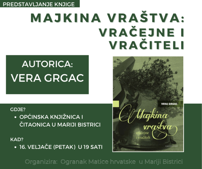 Ogranak Matice hrvatske u Mariji Bistrici organizira predstavljanje knjige Vere Grgac ''Majkina vraštva: vračejne i vračiteli'', koje će biti održano u petak, 16. veljače 2024. godine, u Općinskoj knjižnici i čitaonici Marija Bistrica s početkom u 19 sati. Radi se o knjizi koja na jedinstven, duhovit i jezično izvoran način, objedinjuje narodnu medicinu, recepte biljnih i drugih pripravaka te etnografske zapise iz obližnjeg Bistranskog kraja. Knjigu je izdala Kajkaviana, a u Mariji Bistrici će ju predstaviti autorica Vera Grgac i urednica Vlasta Horvatić-Gmaz.
