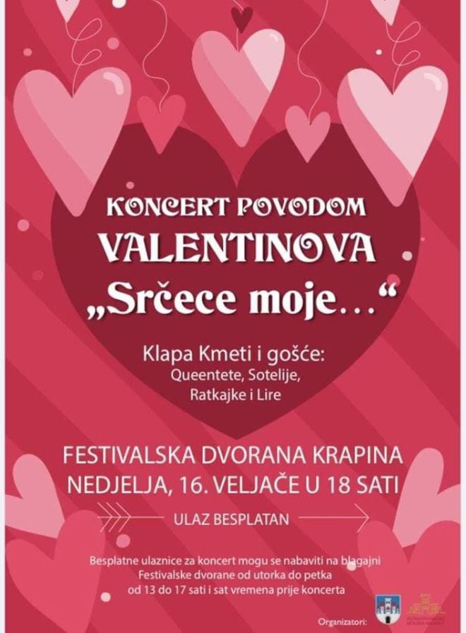 Koncert će se održati u nedjelju 16. veljače s početkom u 18 sati. Povodom Valentinova, dana zaljubljenih, pjevat će se najljepše i najpoznatije ljubavne pjesme. Nastupit će klapa Kmeti i njihovi gosti - Queentete iz Krapine, Sotelia iz Huma na Sutli, Ratkajke iz Vinagore te Lire iz Đurmanca. Ulaz na koncert je slobodan. Besplatne ulaznice možete preuzeti na blagajni Festivalske dvorane u Krapini, i to svakim radnim danom (osim ponedjeljka) od 13 do 17 sati ili na sam dan događanja sat vremena prije koncerta.