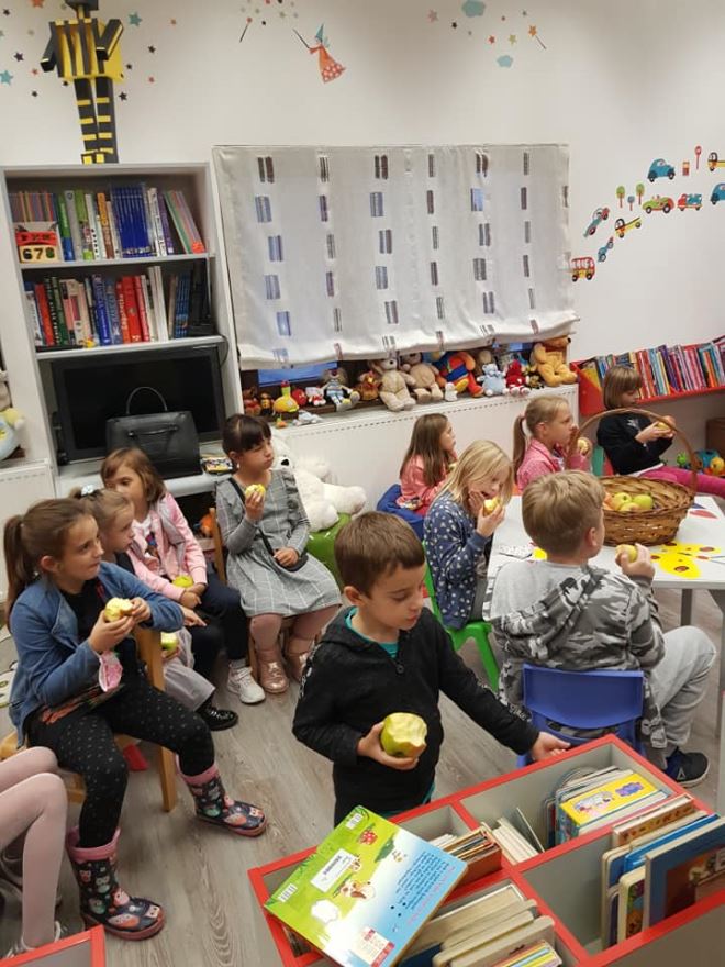 Okupljenoj je dječici teta pričalica Danica Pelko pričala vrlo zanimljive priče, a kako je ove godine tema Dječjeg tjedna voće i povrće, okupljenima su podijeljene jabuke.