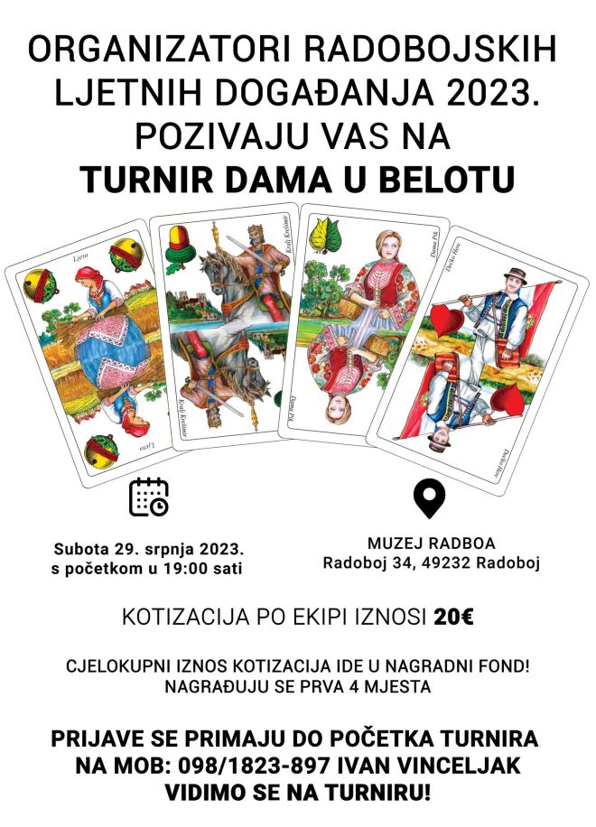 Sljedeće subote, 29. srpnja u 19.00 sati, na terasi Muzeja Radboa, organizira se drugi po redu turnir dama u belotu. Kotizacija po ekipi iznosi 20€, a izvlačenjem će se odrediti raspored za početak turnira. Za najuspješnije ekipe osigurane su nagrade za 1.,2.,3. i 4. mjesto. Sve će upotpuniti roštilj, zabava i dobro druženje.