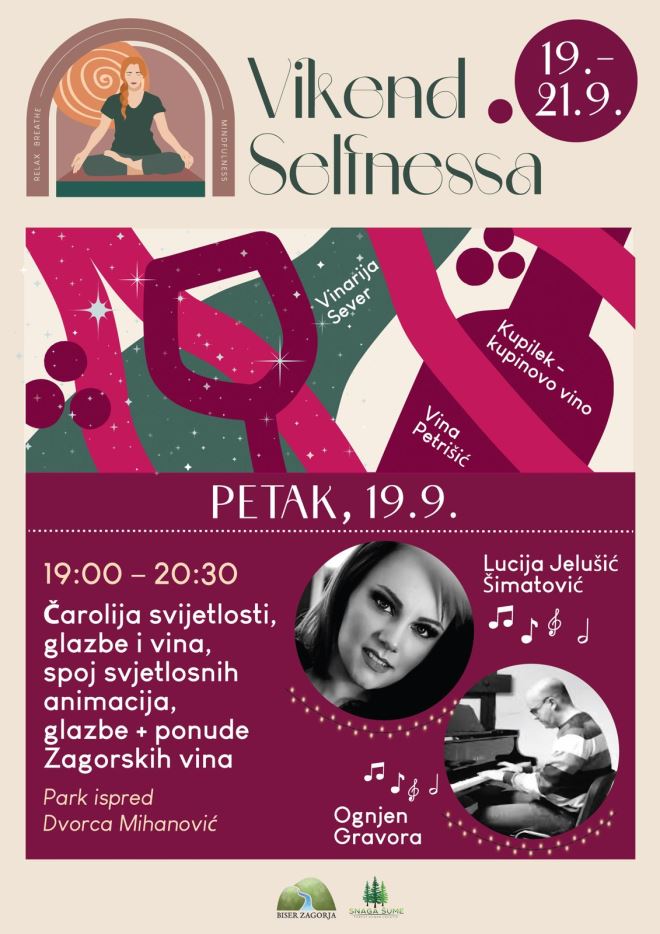 -Krećemo u petak sa Čarolijom svijetlosti, vina i glazbe! Od 19:00 sati u parku Dvorca Mihanović uživajte u svjetlosnim efektima i instalacijama uz degustaciju probranih vina Zagorja i zvucima glazbe Lucije Jelušić Šimatov i Ognjena Gravora - poručuju organizatori!