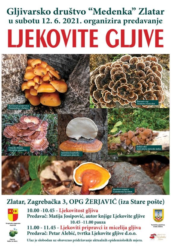 Gljivarsko društvo Medenka Zlatar, u subotu 12. lipnja organizira predavanje 'Ljekovite gljive'. Predavanje će se održati na OPG-u Žerjavić, Zagrebačka 3, iza Stare Pošte. Od 10 sati predavanje o ljekovitosti gljiva održat će Matija Josipović, autor knjige Ljekovite gljive. Od 11 sati o ljekovitim pripravcima iz micelija gljiva govorit će Petar Alebić iz tvrtke Ljekovite gljive do.o.