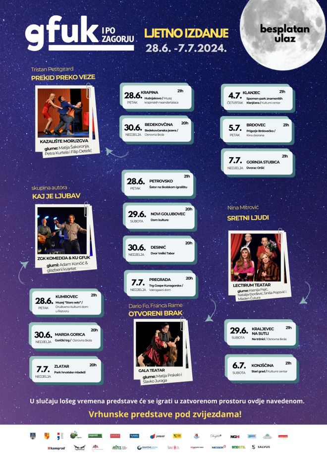 Na rasporedu su četiri izvanredna naslova koji će se izvoditi u posebnim otvorenim prostorima, prilagođenima ljetnom ambijentu i prirodnoj ljepoti Zagorja. Ovaj festival ne samo da pruža kulturnu obogaćenost, već i doprinosi promociji i valorizaciji lokalnih sredina, spajajući umjetnost i zajednicu na jedinstven način. Pogledajte premijerne naslove; Kazališta Moruzgva „Preki preko veze“ u kojoj igraju Petra Kurtela, Matija Šakoronja i Filip Detelić te Lectirum Teatra „Sretni ljudi“ u kojoj igraju Ksenija Pajić, Natalija Đorđević, Siniša Popović i Mladen Ćutura. Tu su još dvije zanimljive predstave: Produkcija Kulturne udruge GFUK i ZGK Komedija „Kaj je ljubav“ u kojoj igra Adam Končić s glazbenim kvartetom i Gala teatar „Otvoreni brak“ u kojoj igraju Matija Prskalo i Slavko Juraga.