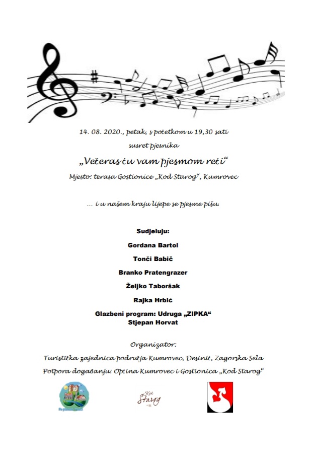 Tradicionalno događanje u Kumrovcu, pod organizacijom TZ područja Kumrovec, Desinić i Zagorska Sela održat će se na terasi gostionice "KOD STAROG" u petak 14.08.2020. s početkom u 19,30 sati.