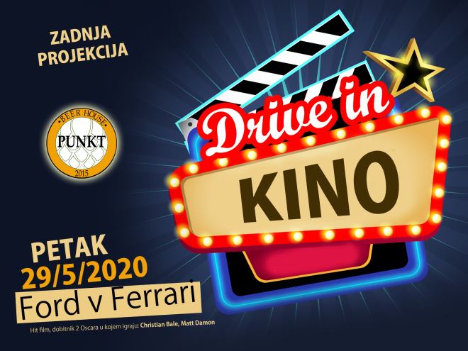 Nakon velikog interesa, Punkt vam daje još jednu priliku da uživate u drive in kinu. Kako bi smanjili gužve u prodaji je konzumacijska ulaznica. - Požuri po svoju na šanku Punkta. Svi posjetitelji u svojim automobilima moći će uživati u vrhunskim filmskim naslovima uz ukusnu hranu i pića restorana Punkt Beer House. Zvuk filma reproducirati će se putem radio valova na radio prijamnike u automobilima i dva velika zvučnika kod platna. Svi će biti zadovoljni jer veličina platna je 9,2 x 5,2 metara, jednako kao u kinu.