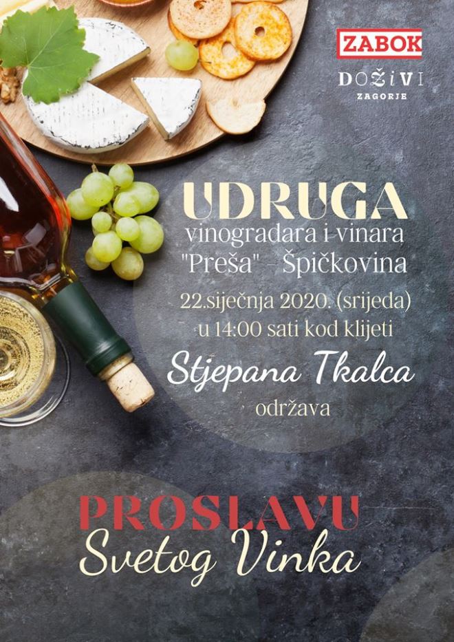 Udruga vinogradara i vinara "Preša" Špičkovina, u srijedu 22. siječnja s početkom u 14 sati kod kleti Stjepana Tkalca u Špičkovini održava tradicionalnu proslavu Sv. Vinka. Svetkovina Vincekova prvi je od pet zapovjedanih pučkih vinogradarskih blagdana uz Sv. Jurja, Sv. Ivana, Sv. Martina i Sv. Mihovila. Obred krštenja vinograda vodit će vlč. Željko Horvat. Pozivaju se svi vinogradari, vinari i ljubitelji dobre kaplice da se pridruže obilježvanju Sv. Vinka i krštenju vinograda. Za sve uzvanike osigurana je bogata ponuda jela i dobrog vina.