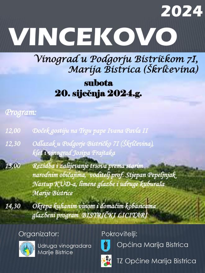 Udruga vinogradara Marije Bistrice, uz pokroviteljstvo Općine Marija Bistrica i Turističke zajednice Općine Marija Bistrica, organizira u subotu 20. siječnja obilježavanje Vincekovoga. Doček gostiju je planiran na Trgu Pape Ivana Pavla II u Mariji Bistrici u 12 sati, a nakon pozdrava organizatora i nastupa Limene glazbe KUD-a Lovro Ježek, oko 12.30 uslijedit će odlazak u Vinogorje Podgorje Bistričko kod kleti i vinograda Josipa Frajtaka, gdje će ceremonijal Vincekovog predvoditi dugogodišnji suradnik bistričkih vinogradara dr. sc. Stjepan Pepeljnjak – biškup Štef.