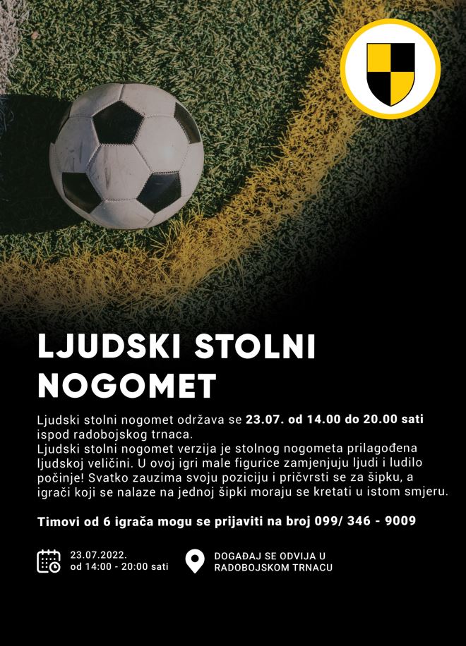 Ljudski stolni nogomet održat će se istog dana od 14 do 20 sati. To je verzija stolnog nogometa prilagođena ljudskoj veličini. U igri male figurice zamjenjuju ljudi i ludilo počinje! Svatko zauzima svoju poziciju i pričvrsti se za šipku, a igrači koji se nalaze na jednoj šipki moraju se kretati u istom smjeru – pojašnjavaju organizatori. Događaj će se održati u Radobojskom trnacu, a zabava je zagarantirana.