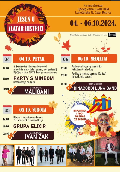 Ovog je vikedna Općina Zlatar Bistrica za sve svoje mještane i posjetitelje pripremila manifestaciju ”Jesen u Zlatar Bistrici” koja će oraspoložiti ove tmurne jesenske dane. U šatoru, na parkiralištu Dječjeg vrtića Zlatni dani u Zlatar Bistrici posjetitelje očekuje pregršt dobre zabave, pjesme, plesa, hrane i pića.