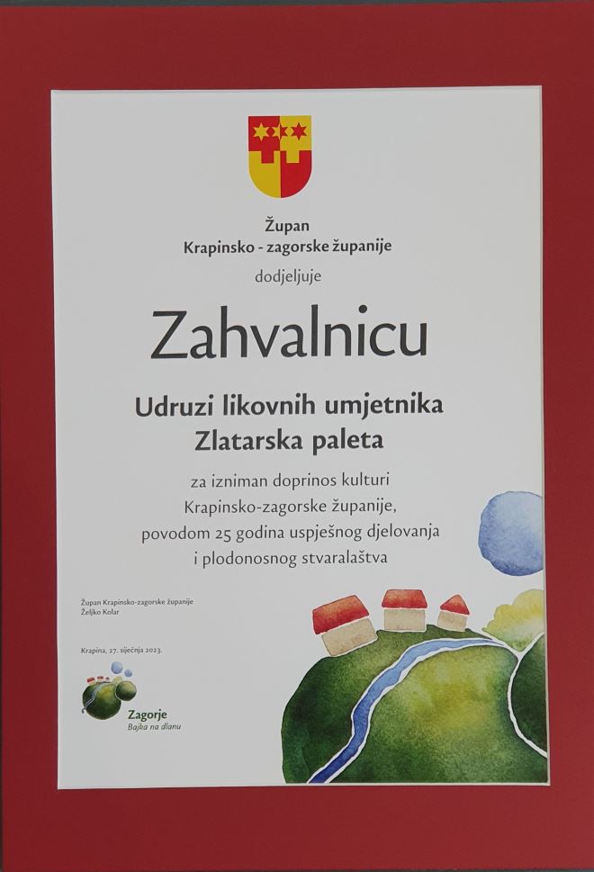 Zamjenica župana Jasna Petek dio ovogodišnje Noći muzeja, u petak, provela je u zlatarskoj Galeriji izvorne umjetnosti, koja je šestu godinu obilježila tradicionalnu manifestaciju što ju organizira Hrvatsko muzejsko društvo. S razlogom, jer je predsjedniku Udruge likovnih umjetnika „Zlatarska paleta“, Darku Vargi, uručila Zahvalnicu za izniman doprinos kulturi Krapinsko-zagorske županije povodom 25 godina uspješnog djelovanja i plodonosnog stvaralaštva.