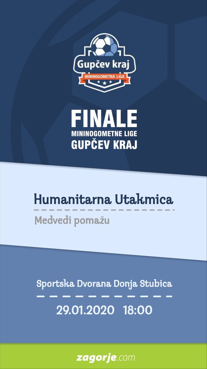 Finalni dan imat će i svoju humanitarnu notu, jer će se pod pokroviteljstvom društva „Medvedi pomažu“ odigrati humanitarnu utakmica između momčadi Medvedi i Bio Vet. Ulaz je slobodan, no na ulazu u dvoranu biti će jedna kutija u kojoj će se skupljati dobrovoljni prilozi za jednu obitelj iz Donje Podgore, koja živi u teškim vrlo skromnim uvjetima. To je još jedan razlog više da večeras budete u Donjoj Stubici. Uz gledanje vrhunskog malog nogometa imate i priliku svojim prilogom pomoći jednoj obitelji koja treba vašu pomoć.