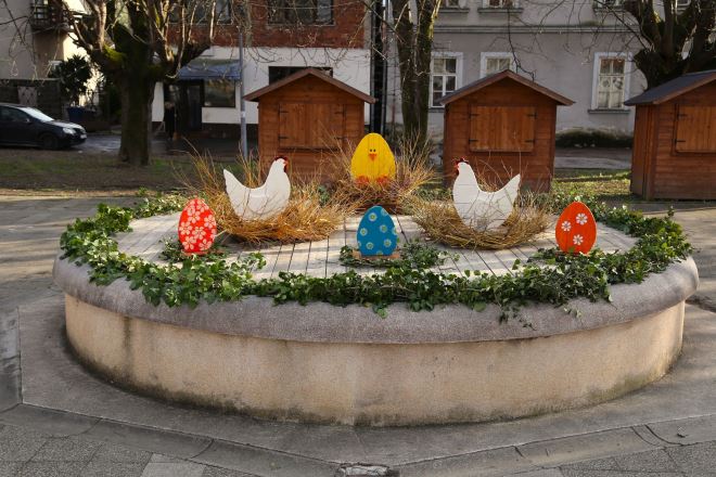 Posebno je ukrašena gradska Fontana prijateljstva u Parku Jure Stubičanca na koju su postavljena tri gnijezda nova gnijezda te u njima sjede “čuče” i pažljivo griju svoja jaja, a u nekima su se već i izvaljali mali pilići.