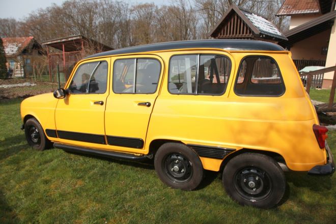 Jeste li kad vidjeli Renault 4 na 6 kotača? Ako jeste, onda je to bio žuti 'renolček' Jurice Bizjaka iz Zlatara, inače vlasnika i poznatog žutog Hammera. - To je jedini Renault 4 na 6 kotača u svijetu – pojašnjava ponosno vlasnik. Sređivao ga je oko dvije godine. - Najprije smo ga s kumčetom postavili u osnovne linije, produžili ga za još jednu osovinu, a onda odveli u limarsku radionicu gdje je dotjeran. Star je 26 godina, on ne može biti oldtimer. Može po godinama, ali čim se izmijeni šraf na originalu on se više ne može certificirati - pojasnio je Bizjak.