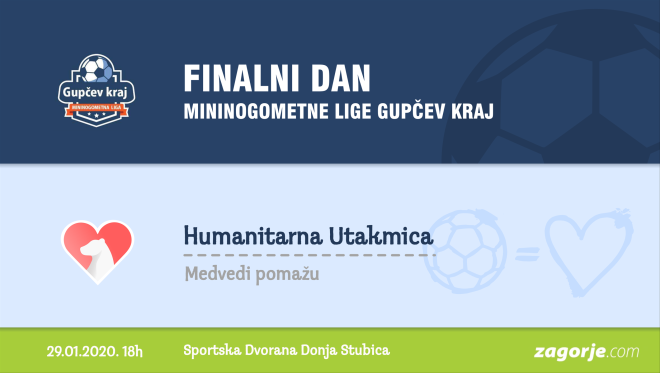 Završni dan lige Mininogometne lige Gupčev kraj će se održati sutra u srijedu 29. siječnja s početkom u 18 sati u Sportskoj dvorani Donja Stubica. Finalnog će se dana između ostaloga održati i humanitarna utakmica između nogometnih ekipa Medvedi i Bio Vet, pod pokroviteljstvom Društva 'Medvedi pomažu'. - Cilj humanitarne akcije prikupljanje je financijske pomoći za obitelj Hučić iz Donje Podgore. Obitelj je to koja već duže vrijeme živi u izuzetno teškim uvjetima, u maloj istrošenoj kući na rubu siromaštva. Skupljena sredstva pomoći će našim susjedima pri kupnji stambenoga kontejnera koji će im uvelike olakšati i poboljšati kvalitetu života. Osjećamo se dužnima pomoći najpotrebnijim članovima zajednice i zato vjerujemo da svi zajedno još jednom možemo pokazati koliko smo zapravo jaki i koliko nam je veliko srce. U nadi da ćete se odazvati u što većem broju, srdačno vas pozdravljamo do srijede – poručili su iz MNL Gupčev kraj i Udruge 'Medvedi Pomažu'.