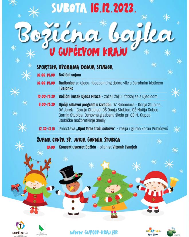 Ove subote 16. prosinca, od 10 do 14 sati, uživajte u božićnoj atmosferi koju donosi raznolik program u Sportskoj dvorani Donja Stubica, kroz manifestaciju 'Božićna bajka u Gupčevom kraju'.