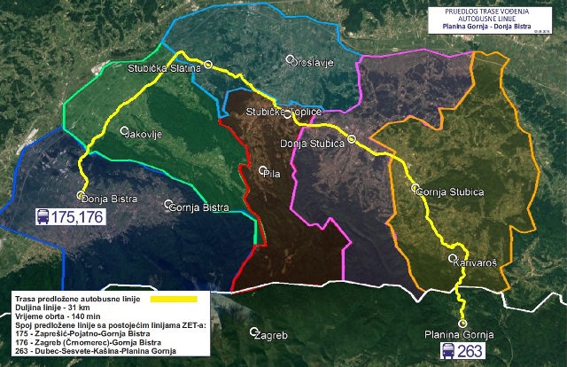 Radi se o liniji od 31 kilometar, od Gornje Planine preko Gornje Stubice, Donje Stubice i Stubičkih Toplica, Slatine, Jakovlja do Donje Bistre i natrag. Kako nam je objasnio načelnik Stubičkih Toplica Josip Beljak, koji je pokrenuo cijelu priču s Bandićem, zasada će autobusi prometovati samo do Gornje Stubice, jer je cesta od Karivaroša prema Gornjoj Planini preuska, s previše uspona i dva klizišta sa zagrebačke strane. – To je revitalizacija linije koja je postojala osamdesetih. Infrastruktura već postoji, stoga neće biti dodatnih ulaganja. Cesta kroz Slatinu i Jakovlje nema toliko uspona, a i stajališta već imamo, sve je zadovoljeno – rekao je Beljak.