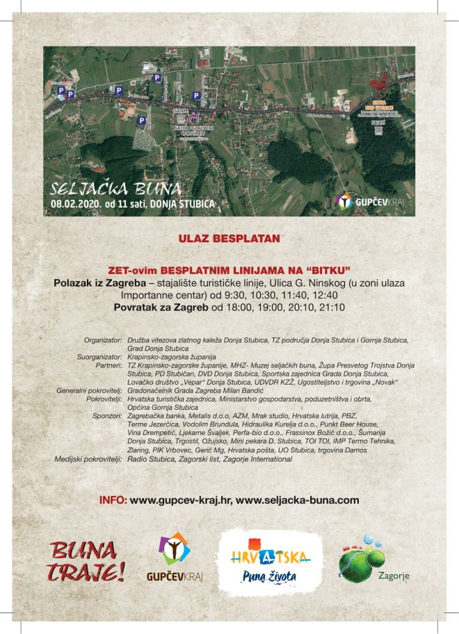 Seljačku bunu su najavili predsjednik Družbe vitezova zlatnog kaleža Ivan Štefek, direktorica Turističke zajednice područja Donja Stubica i Gornja Stubica Kornelija Vnučec, načelnik Općine Gornja Stubica Jasmin Krizmanić, gradonačelnik Grada Donja Stubica Nikola Gospočić, župan Krapinsko-zagorske županije Željko Kolar i gradonačelnik Grada Zagreba Milan Bandić. I ove godine tisuće posjetitelja imati će priliku uživo vidjeti oživljenu Seljačku bunu – Bitku kod Stubice, odnosno prikaz završne bitke Seljačke bune 1573. godine, kojom se u stubičkom kraju tradicionalno obilježava godišnjica bune. Spektakularna bitka seljaka i Tahyjeve vojske, u kojoj je nadmoćnija vojska porazila kmetove predvođene Matijom Gupcem uz mnogobrojna popratna događanja iz godine u godinu privlači sve više posjetitelja. Uz prigodnu rekonstrukciju bune bit će održan i sajam starih zanata, široka ponuda domaćih specijaliteta te kao i svake godine puno zabave.