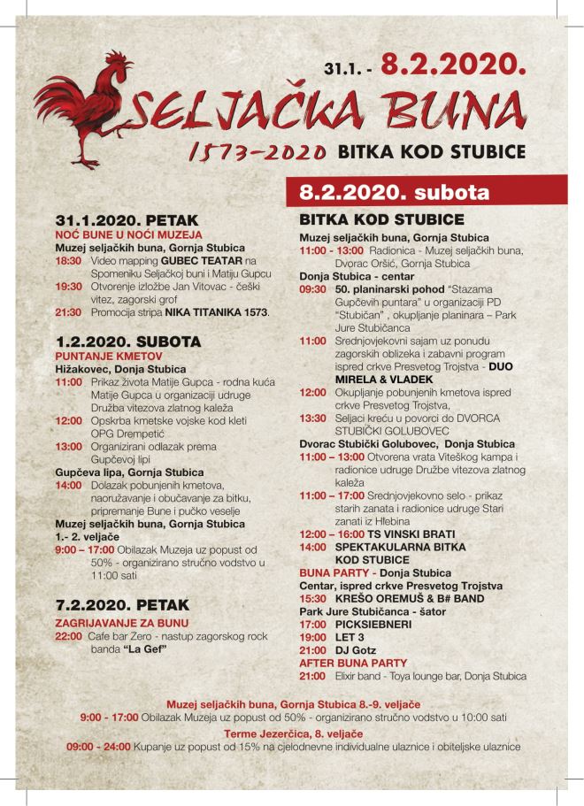 Vjerni prikaz završne bitke na stubičkom polju bit će održan u subotu, 8. veljače. Bitka će biti uprizorena na lokaciji kod dvorca Stubički Golubovec, u blizini samog centra Donje Stubice. Na bojnom polju sudjelovati će više rodova vojski i to pješadija s kratkim i dugim oružjem, s vatrenim oružjem, streličari s lukom i strijelom i samostrelom te kmetska vojska s prekovanim oruđem u oružje. U sklopu manifestacije će Muzej seljačkih buna organizirati obilazak Muzeja uz popust od 50%), dok će Terme Jezerčica imati popust od 15% na cjelodnevne ulaznice za kupanje. Od bogatog zabavnog programa izdvajamo koncert grupe LET3 (8. veljače u večernjim satima). Program počinje već od 11,00 sati i to prvi put na dvije lokacije – u centru Donje Stubice gdje će se, uz srednjovjekovni sajam, okupljati kmetovi te kod dvorca Stubički Golubovec oko Viteškog kampa. U 12,00 sati kreće okupljanje pobunjenih kmetova, koji zajedno s posjetiteljima u 13,30 sati u povorci kreću prema dvorcu Stubički Golubovec, gdje će ih dočekati vojska Franje Tahija, te u 14,00 sati počinje spektakularna završna Bitka kod Stubice.