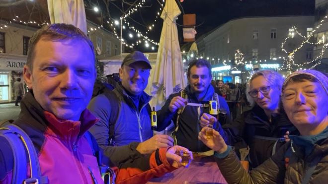 Iz Stubice su krenuli vlakom do Zagreba, gdje su posjetili Advent i malo se zabavili i okrijepili, a onda se 42 veselih planinara okupilo na Trgu Bana Jelačića, odakle su tramvajem stigli do Gračana pa se Leustekovom stazom popeli do vrha Sljemena.
