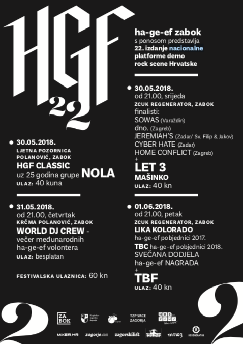 Ha|Ge|eF ZABOK s ponosom predstavlja 22. izdanje nacionalne platforme demo rock scene Hrvatske na kojem će kroz tri dana nastupiti Let 3, TBF, Mašinko, Nola, pobjednici iz 2017. Lika Kolorado te finalisti ovogodišnjeg natjecanja: Sowas (Varaždin), dno. (Zagreb), Jeremiah's (Sv. Filip & Jakov) , Cyber Hate (Zadar) i Home Conflict (Zagreb). Održat će se na dvije lokacije: ZCUK Regenerator i Krčma Polanović u Zaboku od 30. svibnja do 1. lipnja. Festivalska ulaznica košta 60 kuna i moguće ju je kupiti u pretprodaji u Polanoviću. Dnevna ulaznica iznosi 40 kuna.