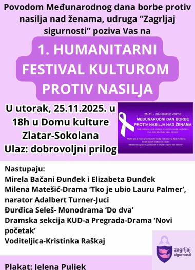 Festival organizira udruga Zagrljaj sigurnosti povodom Međunarodnog dana borbe protiv nasilja nad ženama, a ulaz je slobodan uz dobrovoljni prilog.