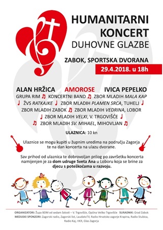 U organizaciji mladih Zagorskog arhiđakonata u nedjelju 29. travnja u novoj sportskoj dvorani Zabok s početkom u 18 sati održat će se humanitarni koncert duhovne glazbe. Na koncertu će uz zborove mladih s područja Zagorskog arhiđakonata i Krapinsko-zagorske županije nastupiti glazbenici duhovne glazbe Alan Hržica, Amorese i mnogi drugi te legendarni zagorski tekstopisac, glazbenik i umjetnik Ivica Pepelko.