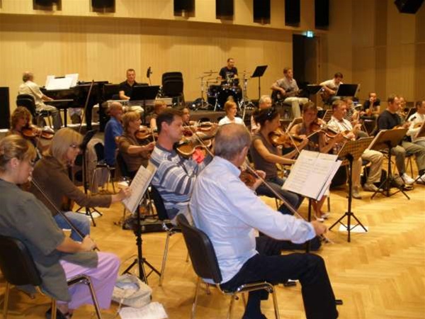 Siniša Leopold za dirigentskim pultom, u trapericama i sportskoj majici, strpljivo je davao upute članovima Revijskog orkestra HRT-a. Među njima, odmah je prepoznatljiv klarinetist Branko Ovčarić, dugogodišnji autor prisutan na festivalskoj pozornici.