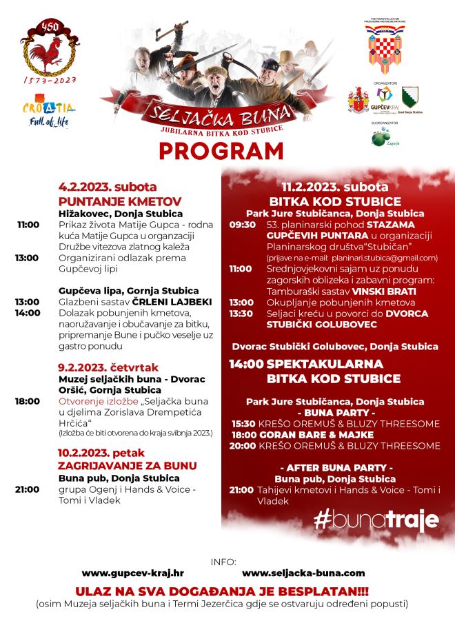Ove subote, 4. veljače, dođite u Gučev kraj, gdje će se održati Puntanje kmetov. Pobunjeni kmeti i seljaci zajedno s Matijom Gupcem dogovarat će veliku Seljačku bunu. Program kreće prikazom života Matije Gupca kod rodne kuće u naselju Hižakovec (Donja Stubica).