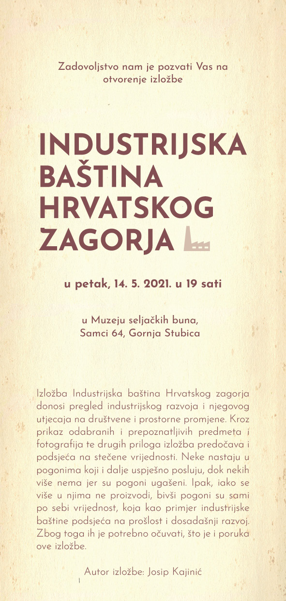 U Muzeju seljačkih buna u Gornjoj Stubici u petak 14. svibnja u 19 sati otvara se izložba Industrijska baština Hrvatskog zagorja. Izložba donosi pregled industrijskog razvoja i njegovog utjecaja na društvene i prostorne promjene. Kroz prikaz odabranih prepoznatljivih predmeta, fotografija te drugih ilustrativnih priloga izložba predočava i podsjeća na stečene vrijednosti. Neke i dalje nastaju u pogonima koji i dalje uspješno posluju, dok nekih više nema jer su pogoni ugašeni. Oni međutim iako više ne proizvode, sami po sebi su vrijednost, koja kao primjer industrijske baštine podsjeća na prošlost i dosadašnji razvoj. Zbog toga je iste potrebno očuvati, što je poruka i same izložbe. Izložba ostaje otvorena do 26. rujna.