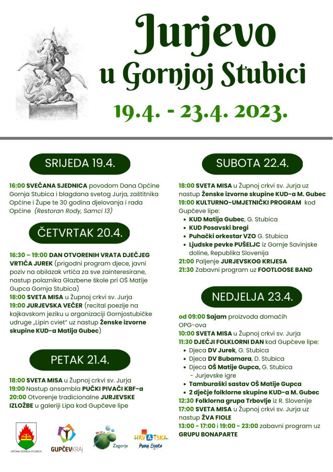 Večeras je na rasporedu centralna proslava s jurjevskim krijesom. Nakon svete mise u 18 sati, od 19 sati pod Gupčevom lipom održat će se kulturno – umjetnički program i kojem će nastupiti domaće kulturno – umjetničko društvo, ali i njihovi gosti, kao i Puhački orkestar VZO Gornja Stubica. Palit će se i jurjevski krijes, na nakon toga svirat će Footloose band.